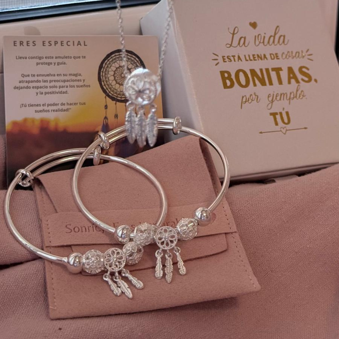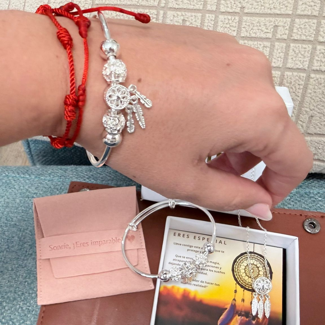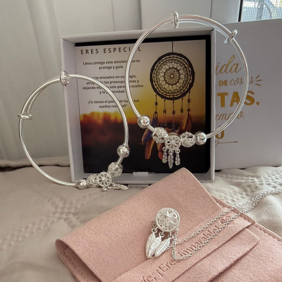 A pulseira Apanhador de Sonhos é fabricada em prata de lei e aço de alta qualidade. Todos os nossos produtos são hipoalergénicos e isentos de níquel, chumbo e cádmio, garantindo uma experiência segura e confortável.