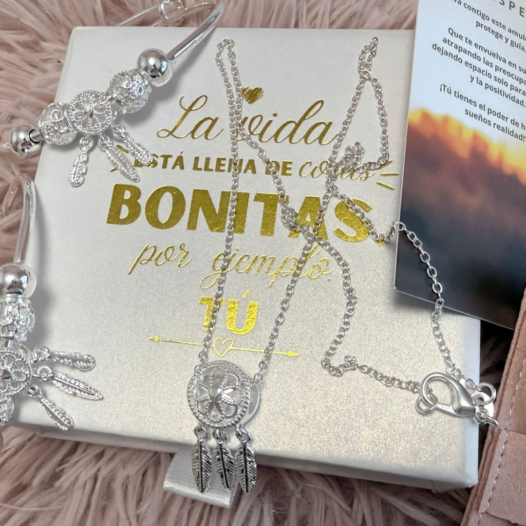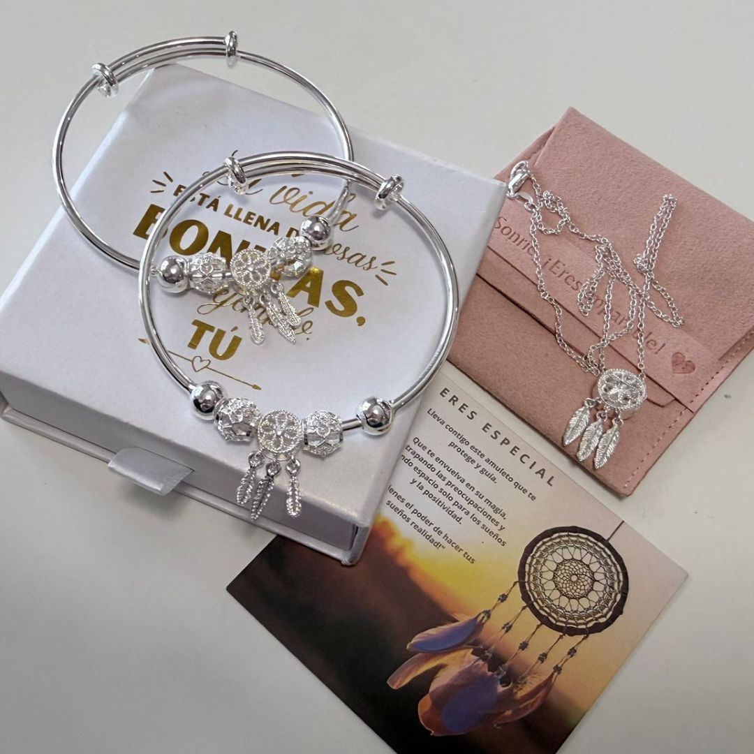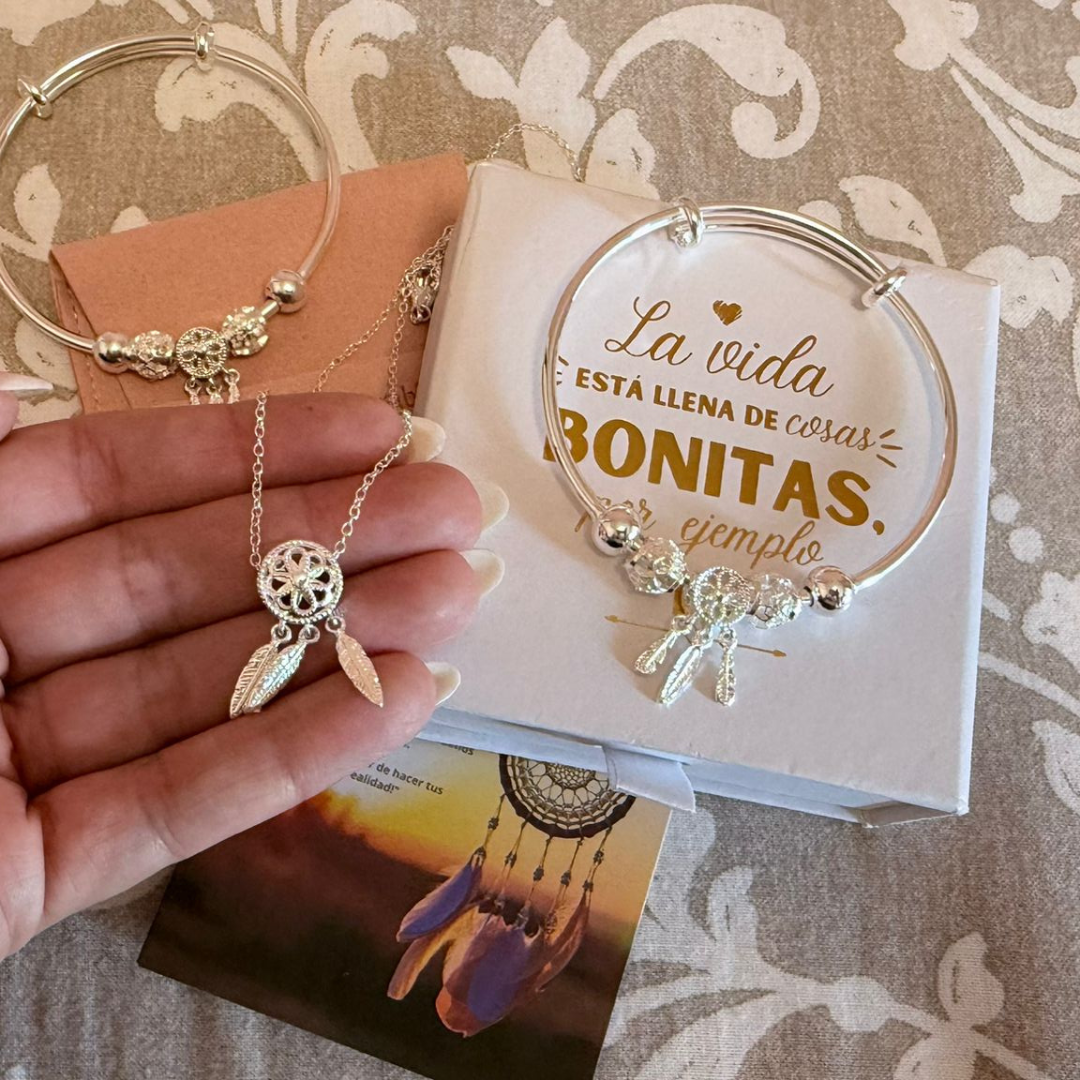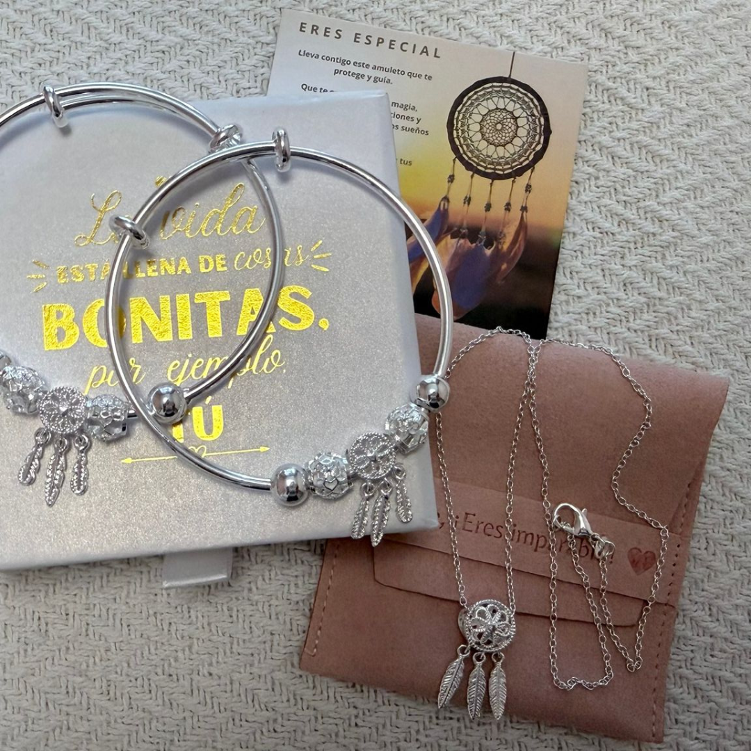 A pulseira Apanhador de Sonhos é fabricada em prata de lei e aço de alta qualidade. Todos os nossos produtos são hipoalergénicos e isentos de níquel, chumbo e cádmio, garantindo uma experiência segura e confortável.